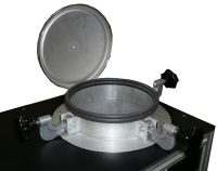 VakuumanlageHeizmantel Deckel: Der Dichtgummi ist auf den Behälterrand aufvulkanisiert. Der Klapp- Deckel wird mit 4 Sterngriffschrauben geschlossen.Kammerdeckel
